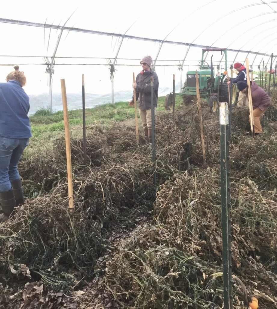 The high tunnel tomatoes didn’t make it through the freeze and so we said goodbye as we cut strings and removed the trellis. Thankfully, our late season beefsteak tomatoes we planted in the greenhouse are still producing, so tomato season goes on! We celebrated our last field planting - all the garlic is now in the ground for next year. This upcoming week we will spread leaves and straw to ready it for overwintering (mulching also helps with weed control).