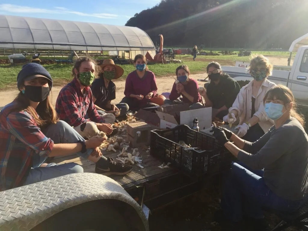 The gang "pops" the garlic bulbs into individual cloves for garlic planting.