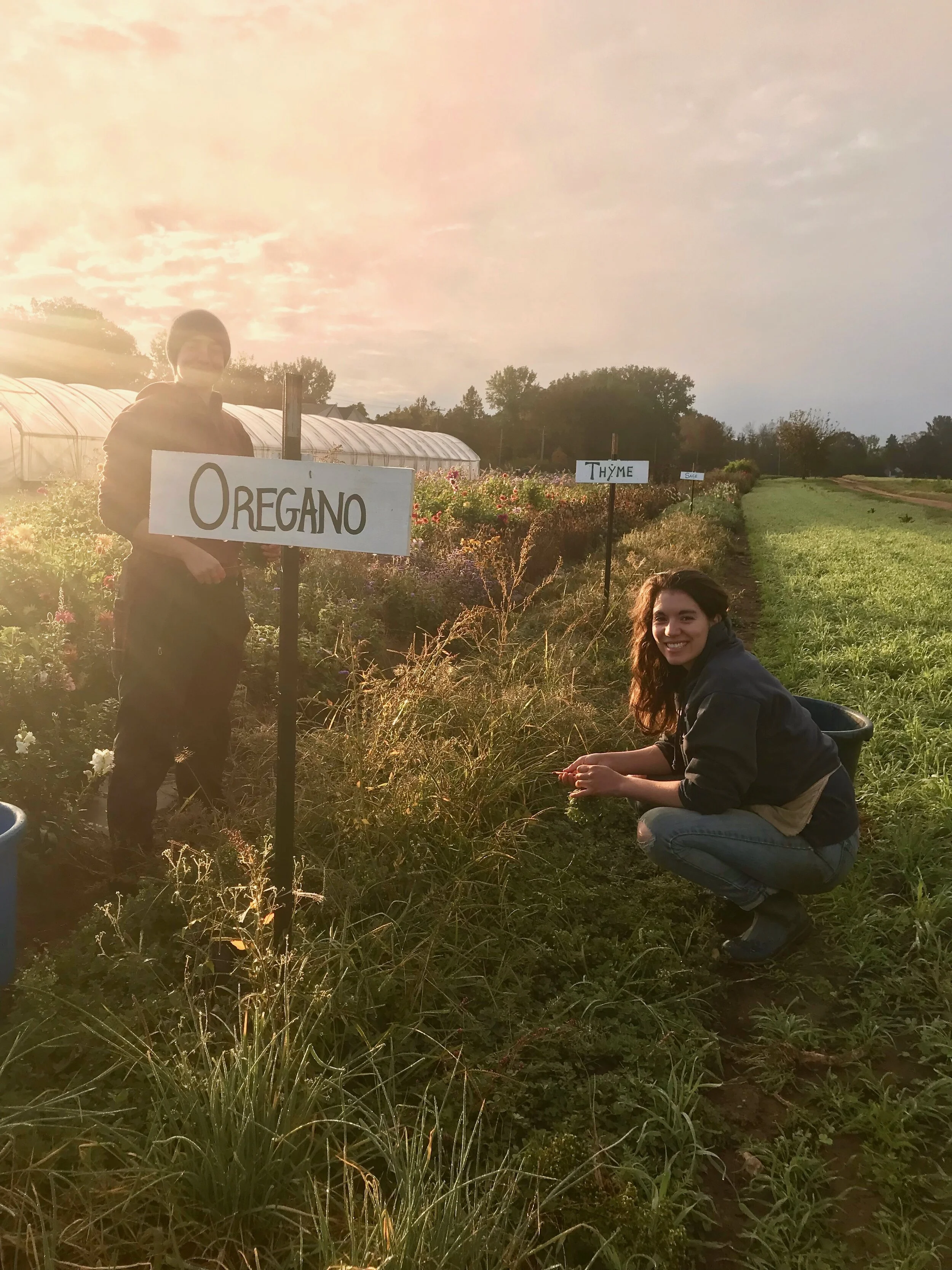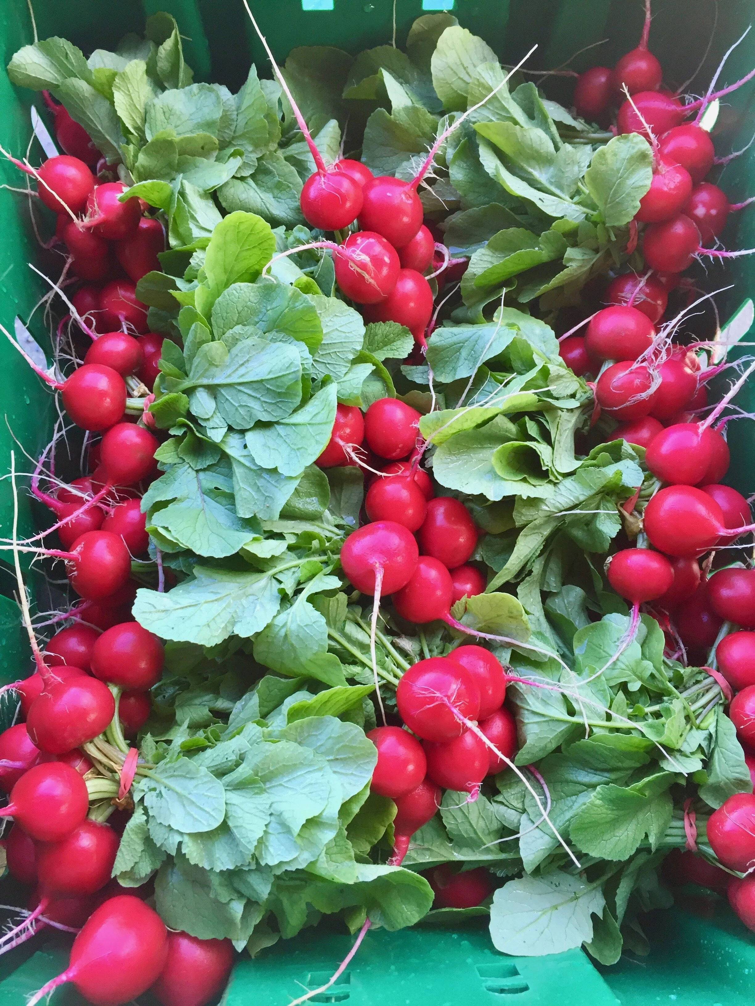 Salad mix, arugula, head lettuce, pea shoots, French Breakfast and red radishes, salad turnips, Red cabbage, savoy cabbage, red, Chioggia, and gold beets, curly and lacinato kale, rainbow chard, parsley, chives, oregano, sage, thyme, rosemary, radicchio, Dark Red Norland, Satina Gold, Blue Gold, Magic Molly, Kennebec and Fingerling potatoes, German Extra Hardy garlic, limited tomatoes, escarole, assorted sweet peppers, mixed Italian and Asian eggplant, hot peppers, leeks, celeriac, baby boy chow, collards, Brussels sprouts, butternut and Kogi Nut squash, sweet potatoes, fresh young ginger, fresh turmeric, limited apples from our certified organic, no-spray orchard