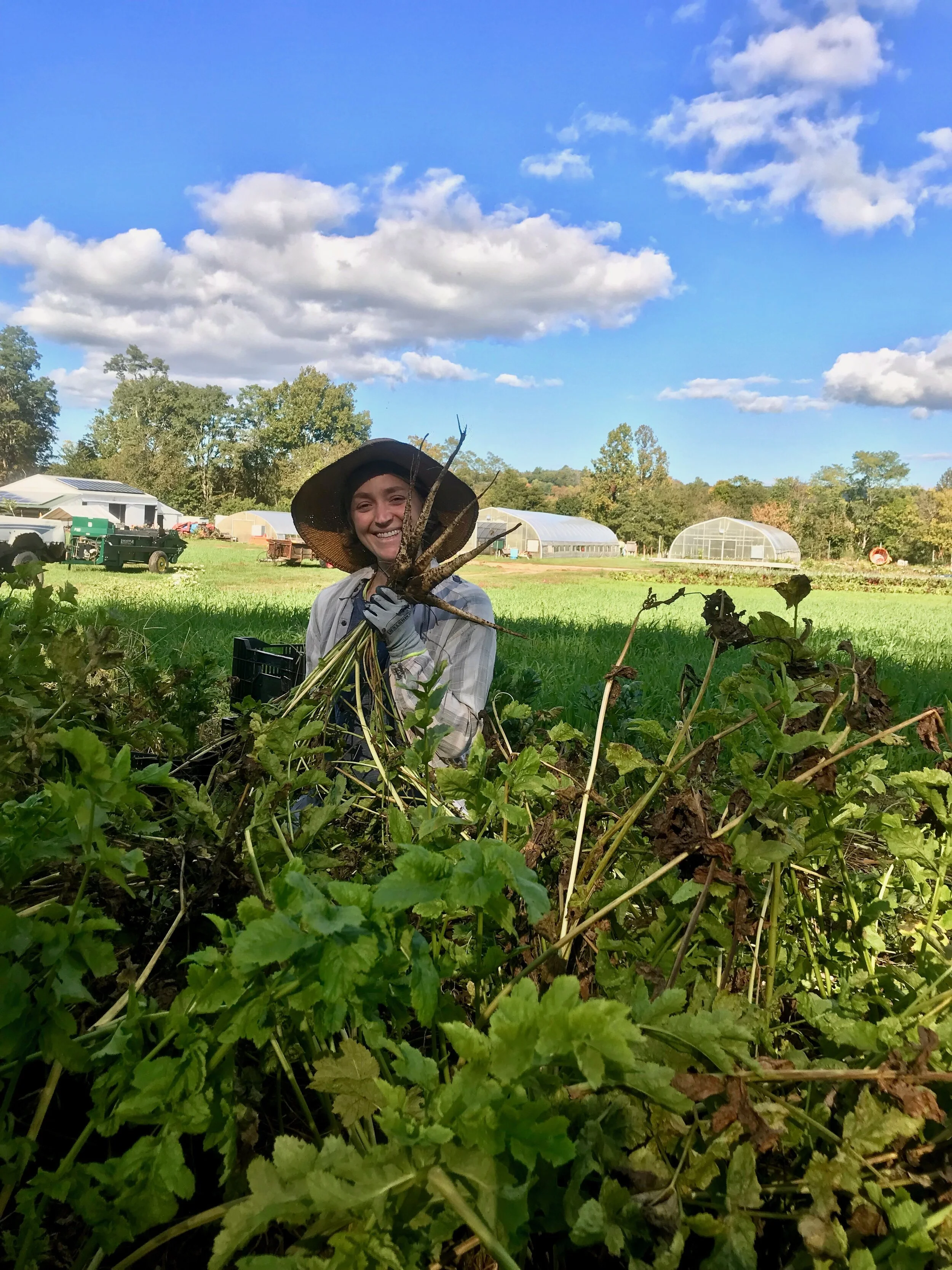 Faye pulls some parsnips with a carefully gloved hand to avoid a rash from their toxic foliage. Good thing these roots taste so good!